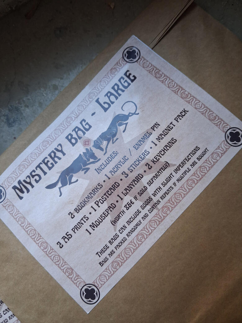Containing a wide variety of goods from both me and my partner for a reduced price. For those, that cannot decide on what to get from our booth.The buyer is informed about the type of items inside.