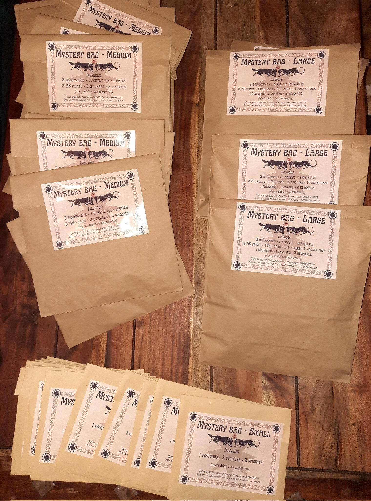 The mystery bags contain a wide variety of goods from both me and my partner for a reduced price. For those, that cannot decide on what to get from our booth.The buyer is informed about the type of items inside,